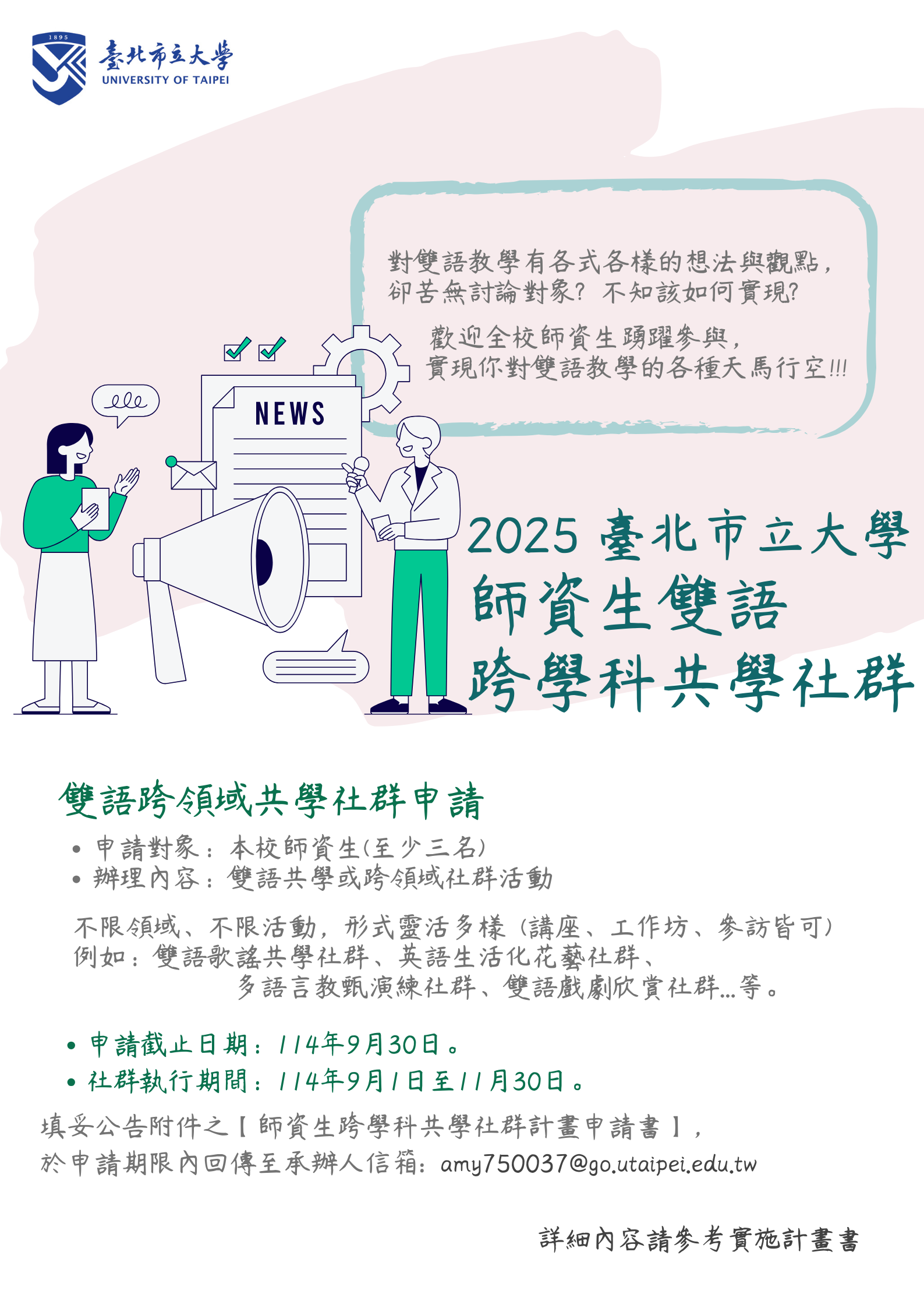 為鼓勵本校教師與師資生建立雙語跨學科共學社群,推動教學經驗交流、教材設計討論與跨領域教學研究發展,臺北市立大學雙語教學研究中心即日起受理申請補助,相關資訊如下: