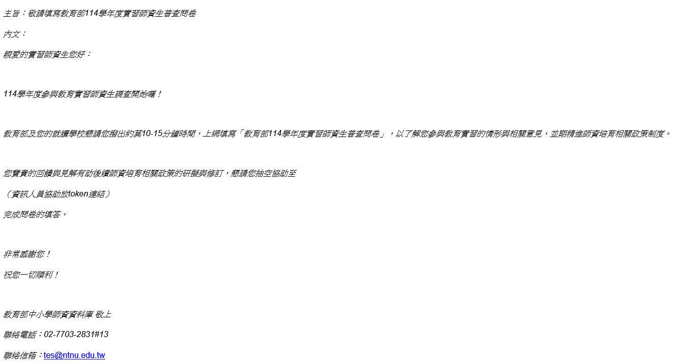 2.中小學師資資料庫平臺將寄給個別實習師資生的問卷上線通知信,信中皆附實習師資生個別專屬的問卷填答連結。(通知信件內容如最下方檢附114學年實習師資生通知信件內容。)