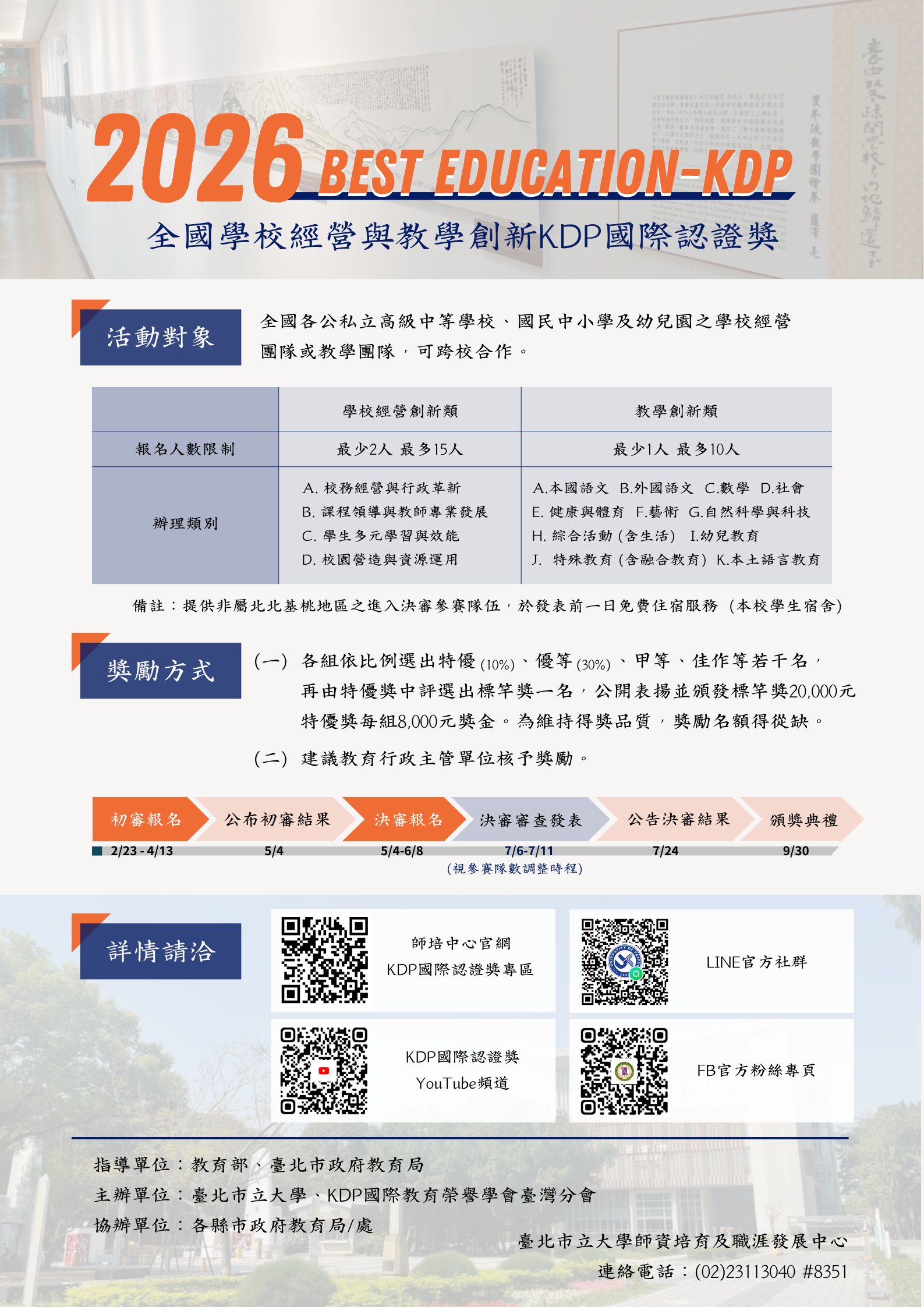 【2026KDP】本校辦理「Best Education-KDP2026全國學校經營與教學創新國際認證獎」活動徵件至4月13日(一),歡迎各縣市學校教師踴躍報名參加。